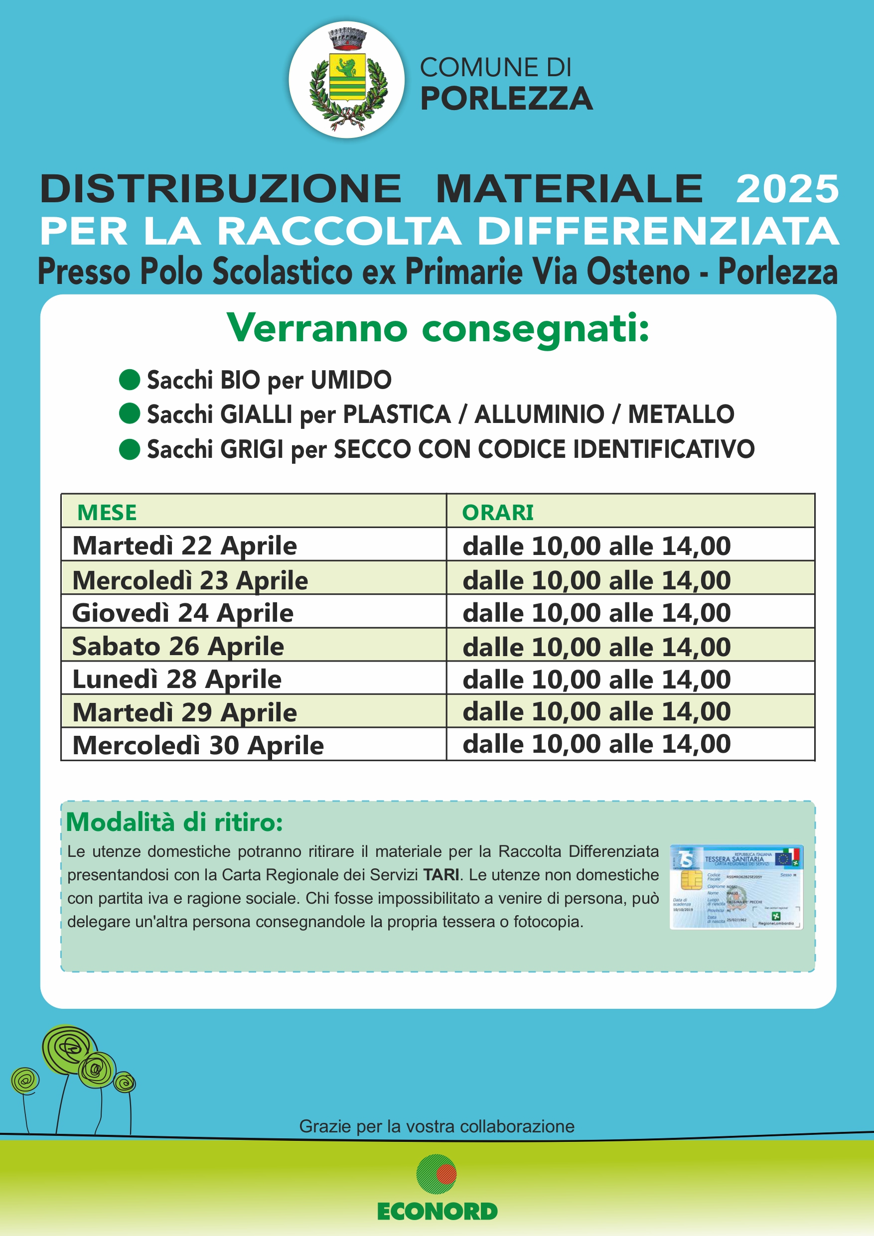 Le utenze domestiche potranno ritirare il materiale per la Raccolta Differenziata presentandosi con la Carta Regionale dei Servizi dell’intestatario TARI.